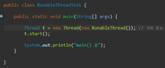새로운 Thread 객체를 생성할 때, 앞서 구현한 클래스를 객체의 형태로 스레드 객체에 파라미터로 넘기는 방식이다. 이를 객체 합성이라고 한다.